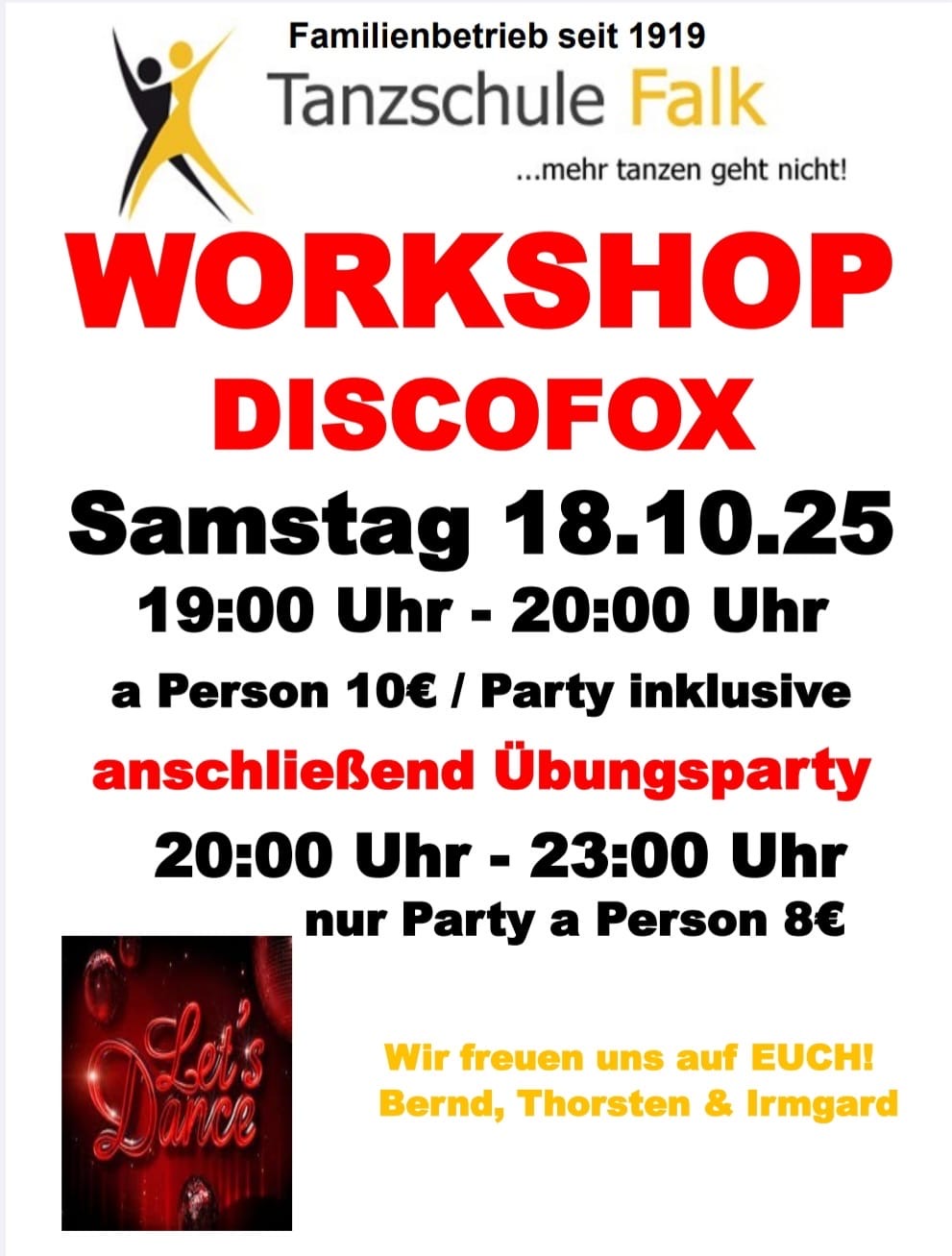 | Discofoxkurs (Stufe 1) | Coesfeld | Sonntag 21.09.2025 | 13:00 Uhr | 60€ pro Person |
